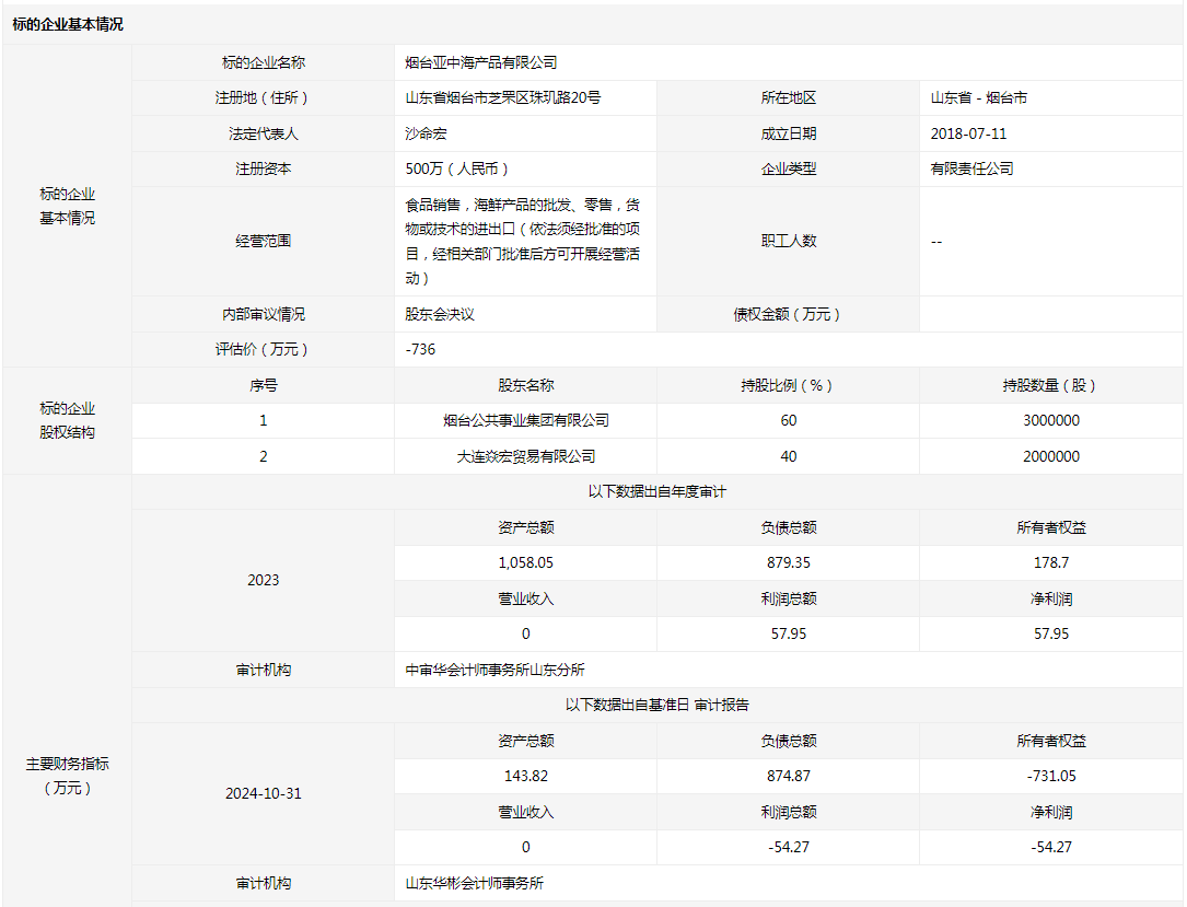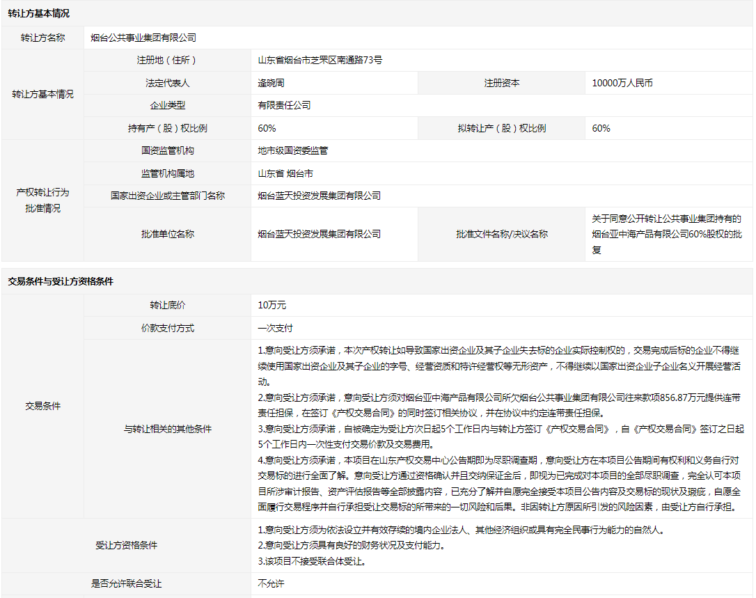 煙臺(tái)亞中海產(chǎn)品有限公司60%國(guó)有股權(quán)
