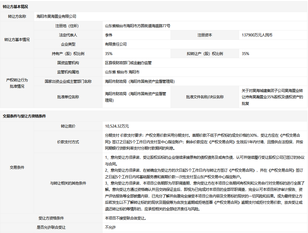 海陽(yáng)市昊瀚置業(yè)有限公司35%股權(quán)及10487.55萬(wàn)元債權(quán)
