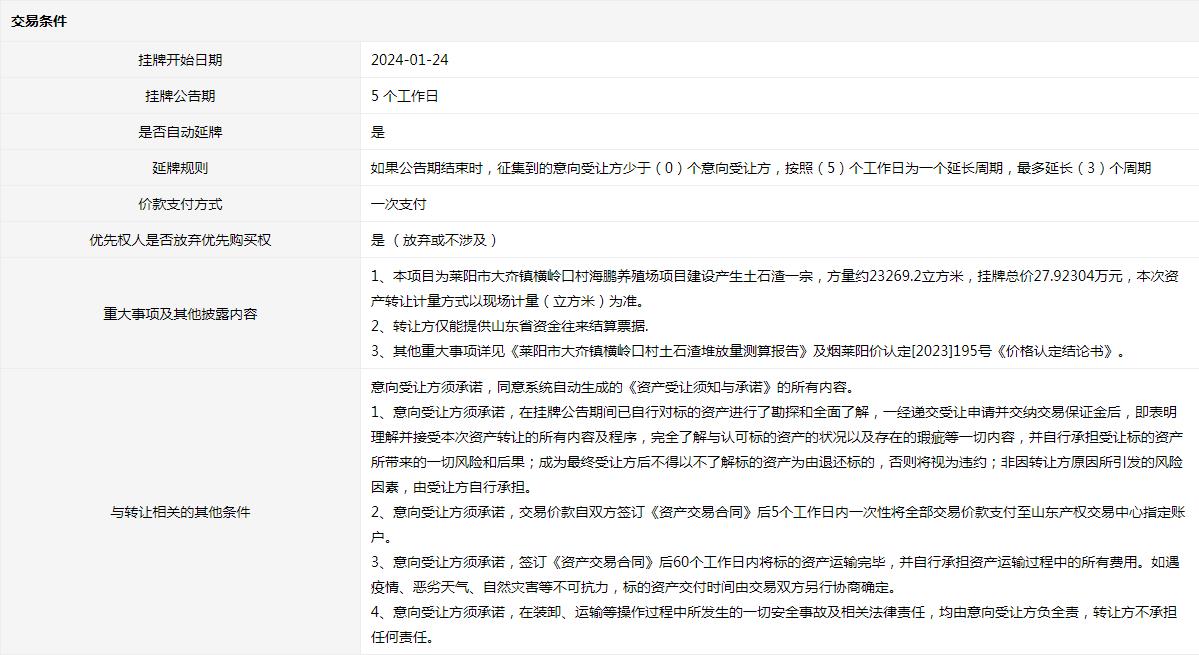 海陽市辛安鎮(zhèn)卓格莊村CX項(xiàng)目平整土地產(chǎn)生部分渣土一宗(1號標(biāo)的)交易公告