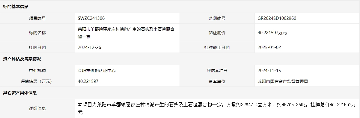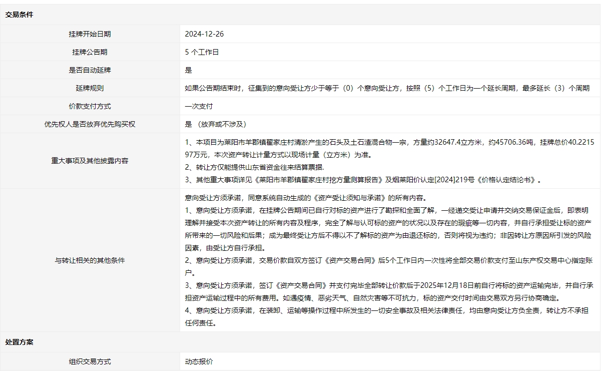 萊陽市姜疃鎮(zhèn)西韓格莊村采礦產(chǎn)生大理石巖石頭及土石渣混合物一宗交易公告