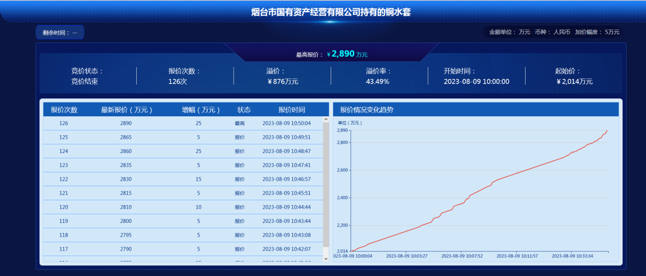 8月9日,煙臺市國有資產(chǎn)經(jīng)營有限公司持有的銅水套項目通過網(wǎng)絡競價的方式公開競價,18名意向受讓方經(jīng)過126次激烈競價,最終以2890萬元的價格成交,溢價876萬元,溢價率43.49%。